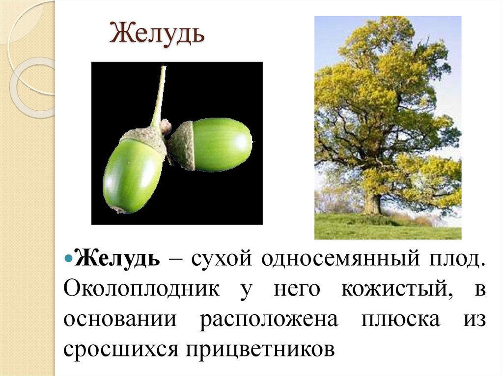 Желудь – сухой односемянный плод.Околоплодник у него кожистый, в