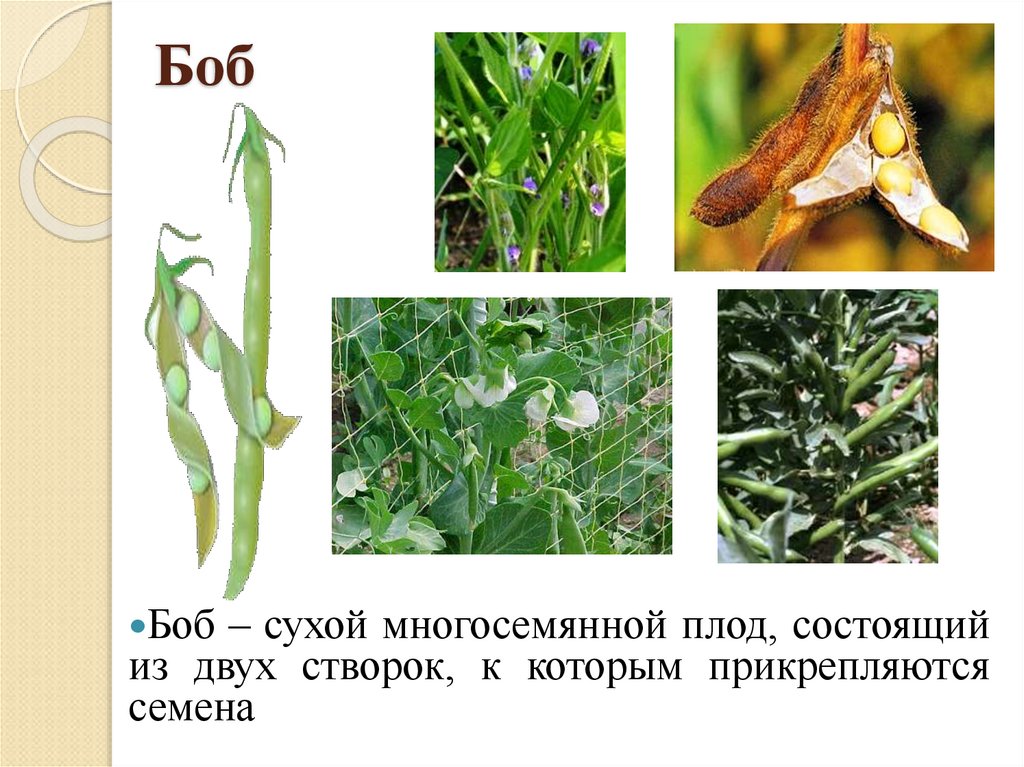 Боб – сухой многосемянной плод, состоящийиз двух створок, к которым прикрепляются