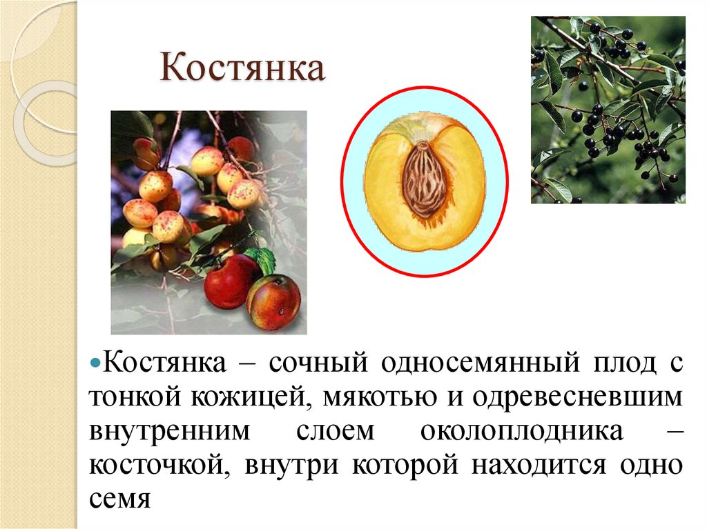 Костянка – сочный односемянный плод стонкой кожицей, мякотью и одревесневшим