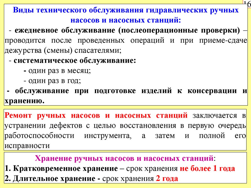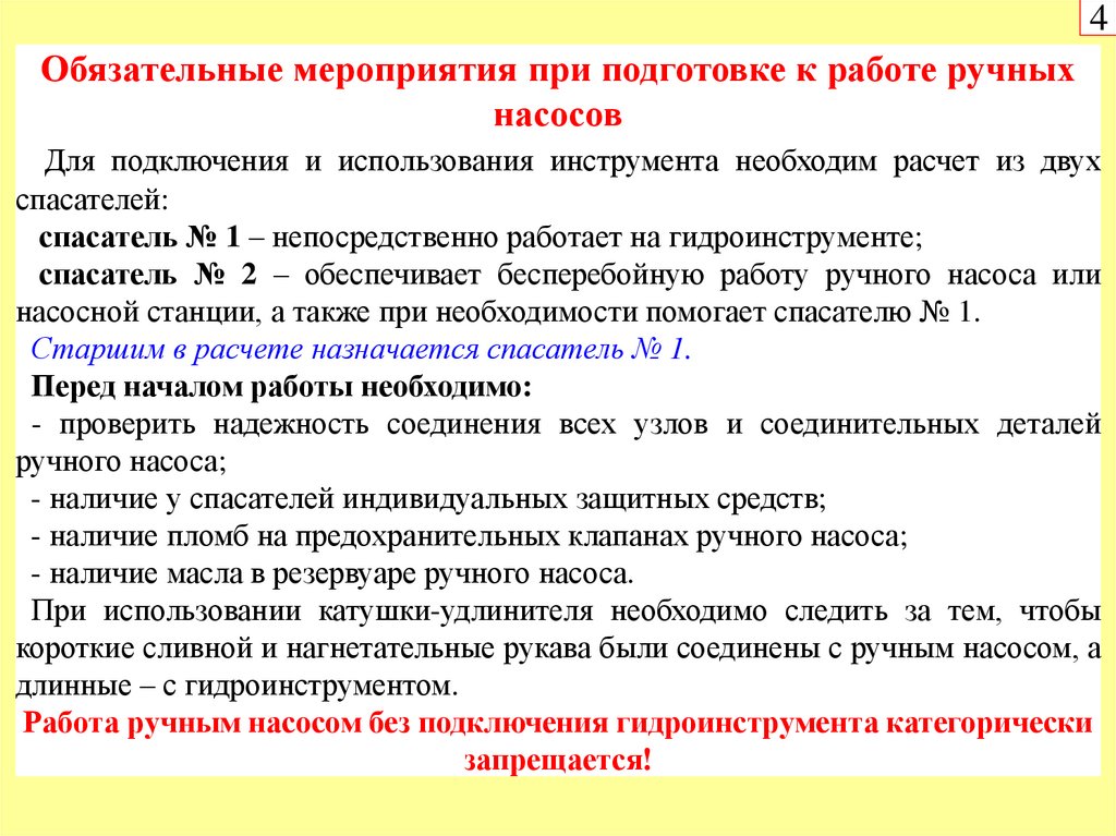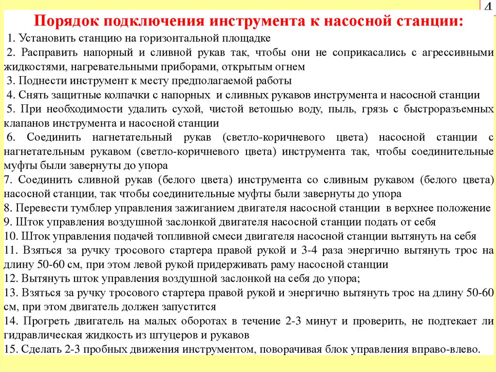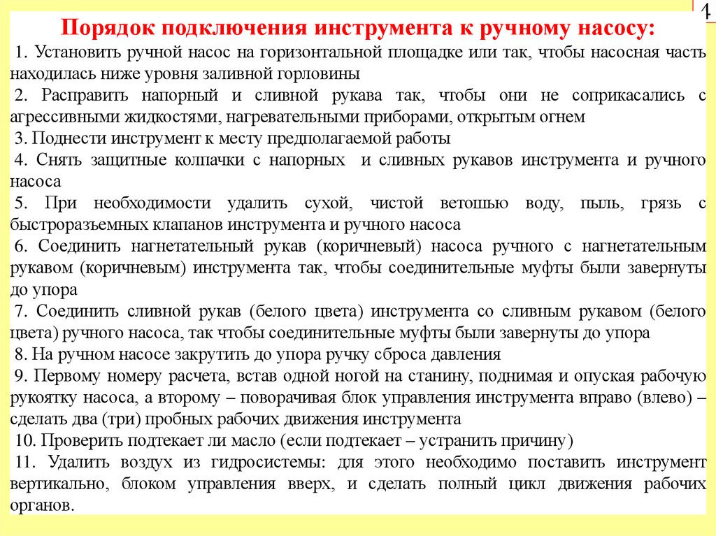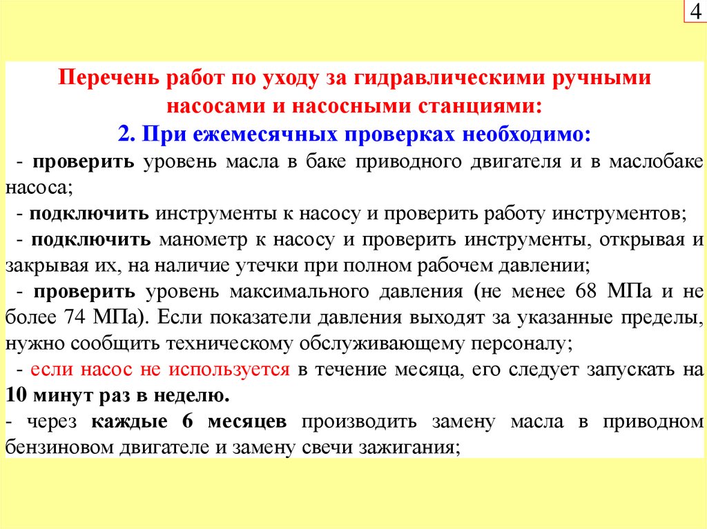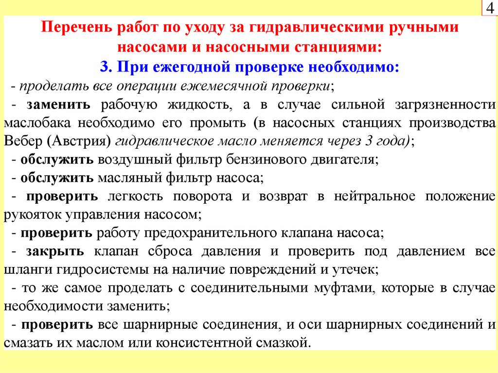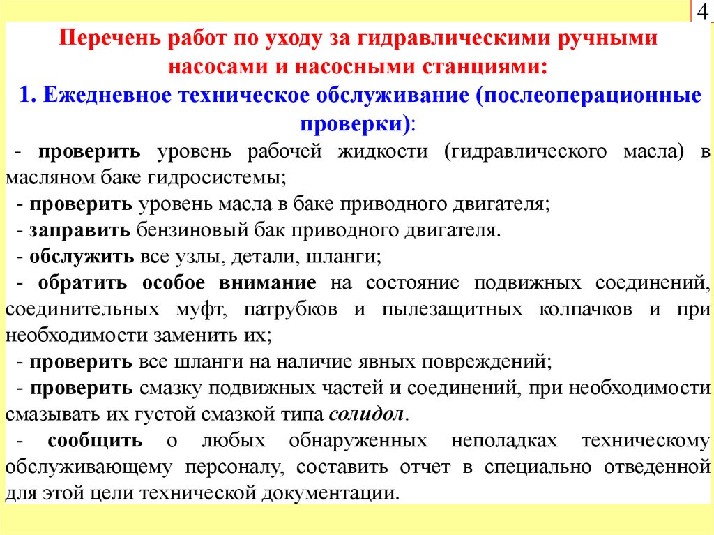 Перечень работ по уходу за гидравлическими ручныминасосами и насосными станциями: