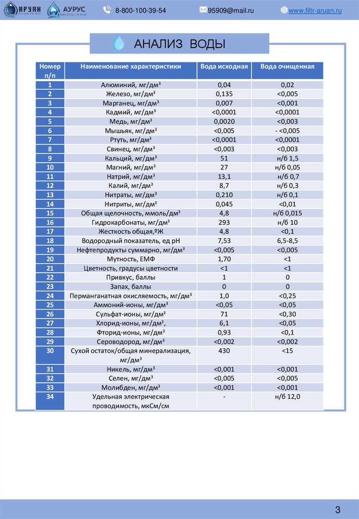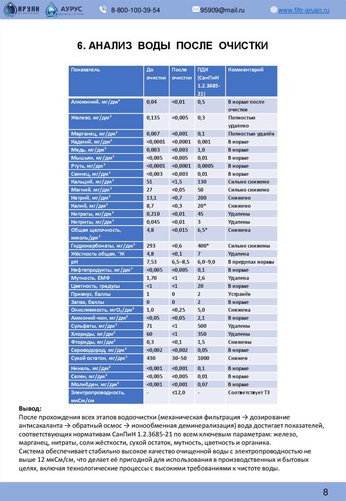 • Полное соответствие показателей воды нормативам СанПиН по железу,