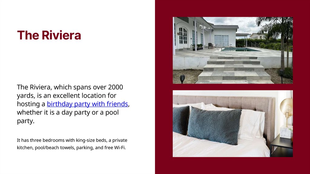 kitchen, pool/beach towels, parking, and free Wi-Fi.