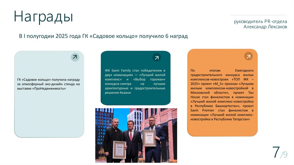 В I полугодии 2025 года ГК «Садовое кольцо» получило 6 наград