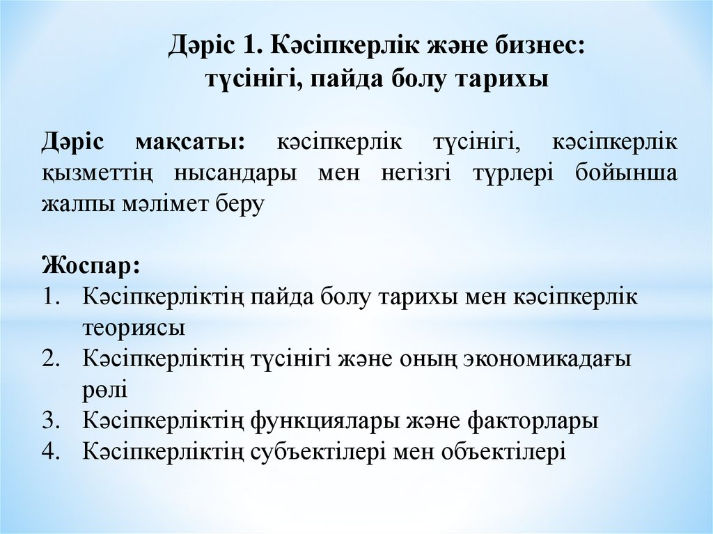Дәріс мақсаты: кәсіпкерлік түсінігі, кәсіпкерлік