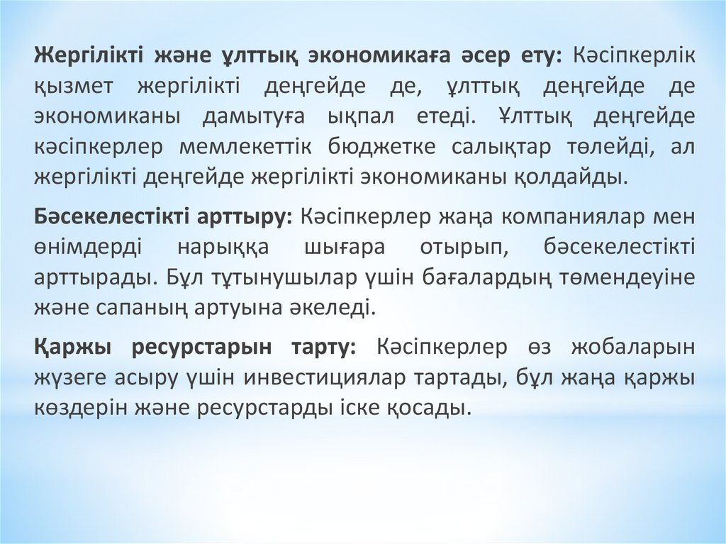 кәсіпкерлік қызметтің алғышарттарын қамтамасыз етіп қана қоймай, сонымен бірге