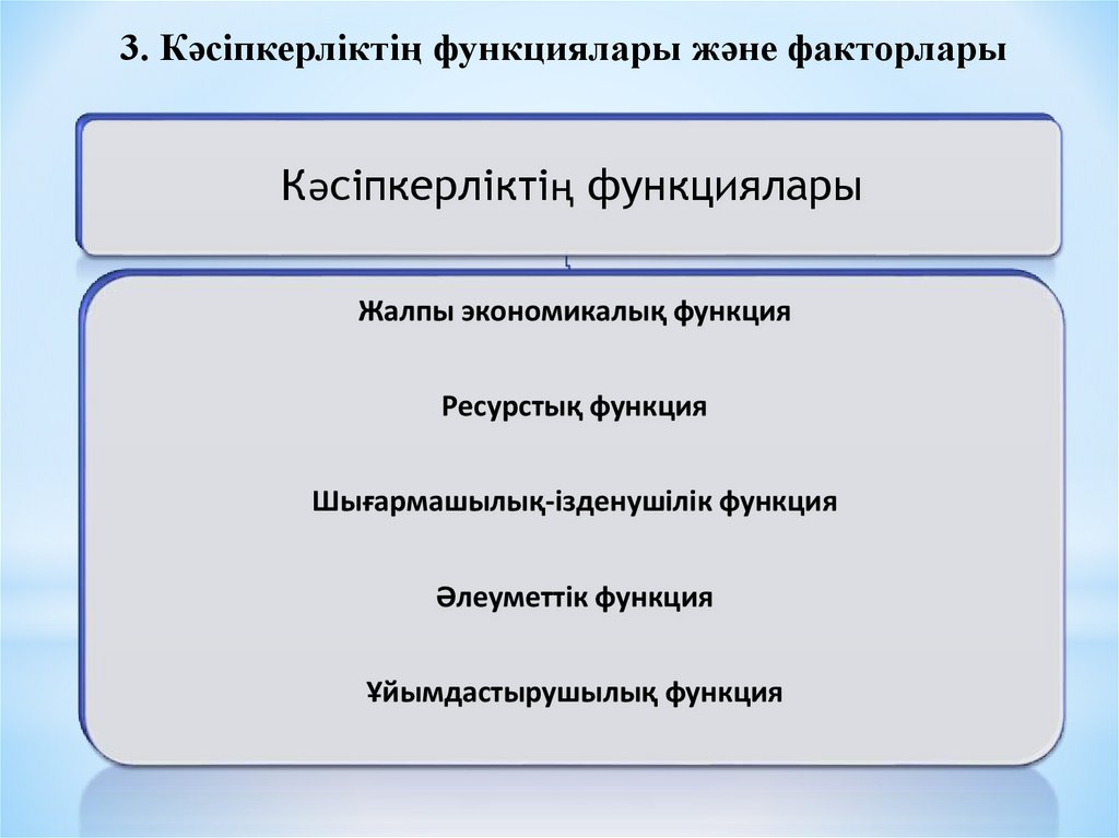 - кәсіпкерлік функцияларын іске асырудың мазмұны мен