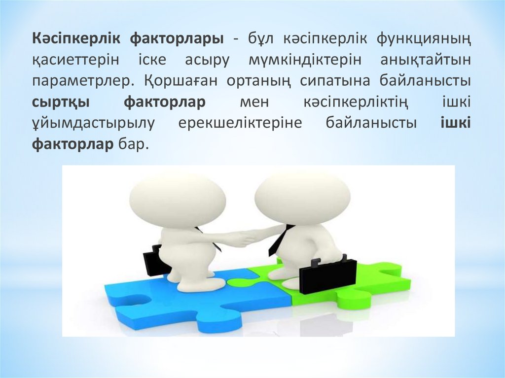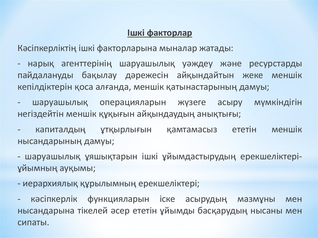 Ішкі факторларКәсіпкерліктің ішкі факторларына мыналар жатады: