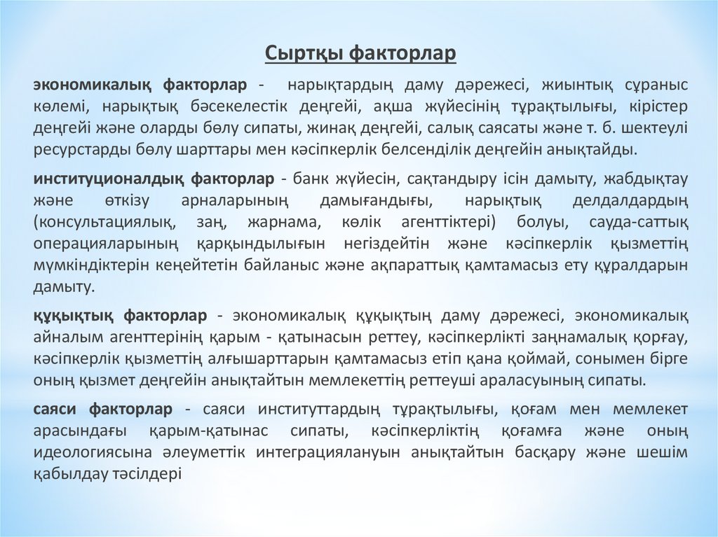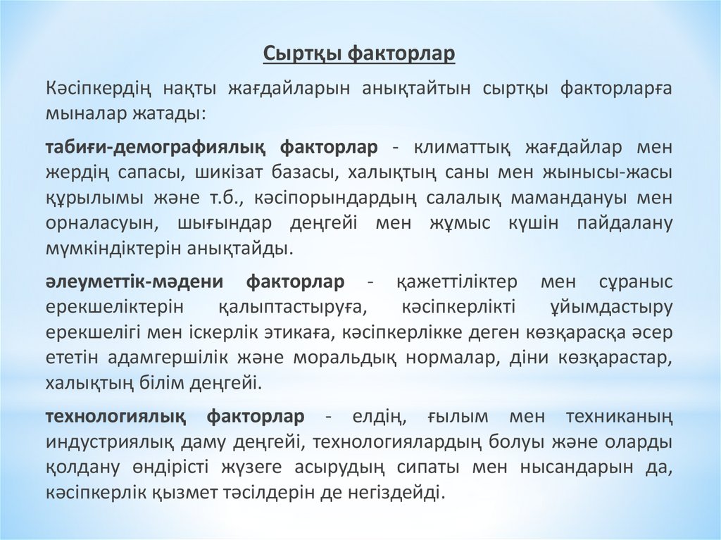 Сыртқы факторларКәсіпкердің нақты жағдайларын анықтайтын сыртқы факторларға