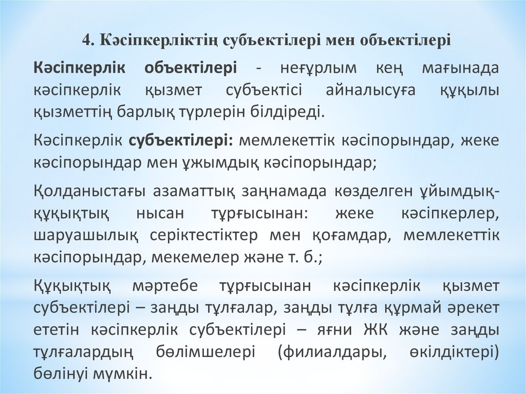 4. Кәсіпкерліктің субъектілері мен объектілері