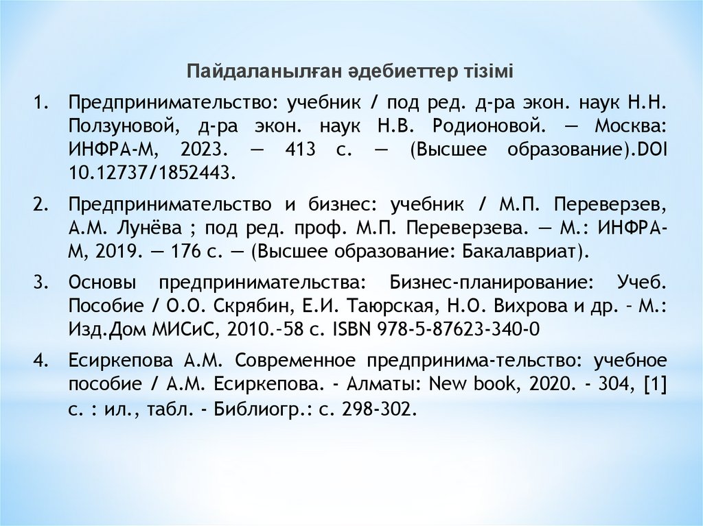 Пайдаланылған әдебиеттер тізімі1. Предпринимательство: учебник / под ред. д-ра экон. наук Н.Н.