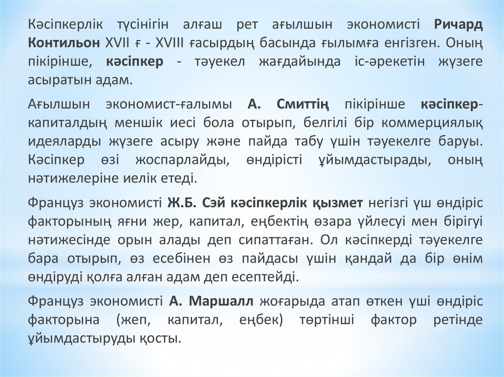 Кәсіпкерлік түсінігін алғаш рет ағылшын экономисті РичардКонтильон ХVІІ ғ - ХVІІІ ғасырдың басында ғылымға енгізген. Оның