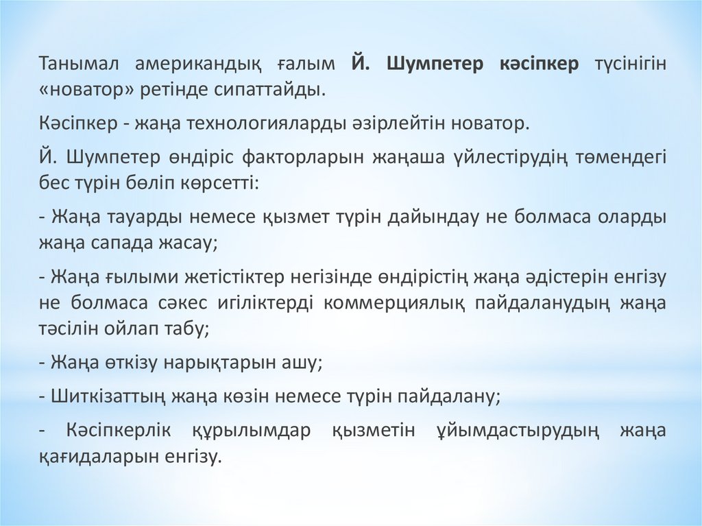 Танымал американдық ғалым Й. Шумпетер кәсіпкер түсінігін«новатор» ретінде сипаттайды.