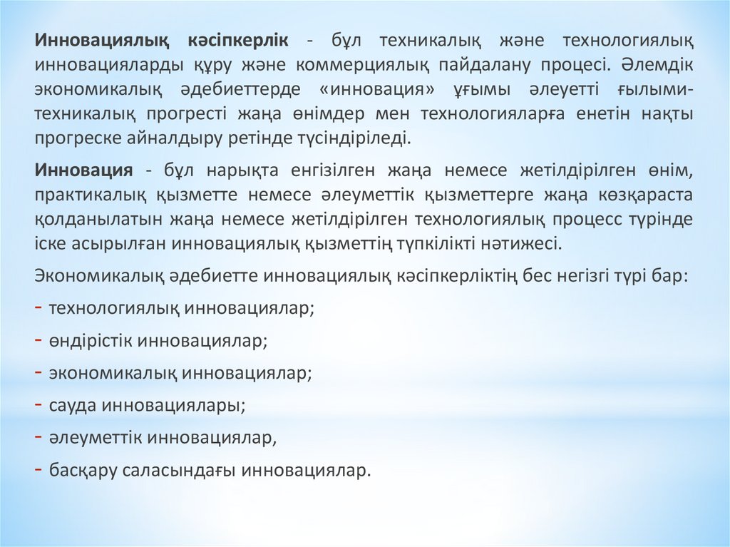 экономикалық әдебиеттерде «инновация» ұғымы әлеуетті ғылымитехникалық прогресті жаңа өнімдер мен технологияларға енетін нақты
