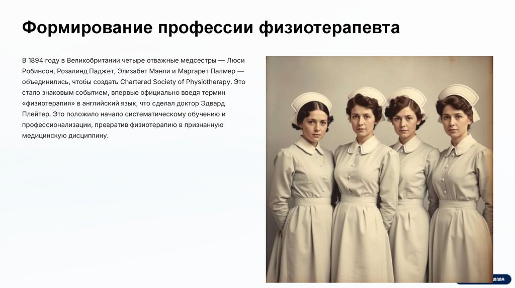 Формирование профессии физиотерапевтаВ 1894 году в Великобритании четыре отважные медсестры — Люси