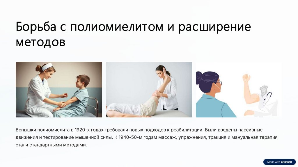 Вспышки полиомиелита в 1920-х годах требовали новых подходов к реабилитации. Были введены пассивные