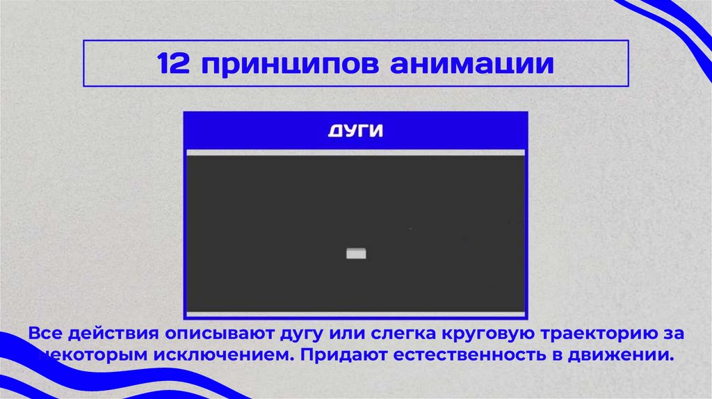 Все действия описывают дугу или слегка круговую траекторию занекоторым исключением. Придают естественность в движении.