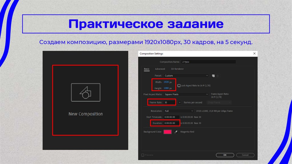 Создаем композицию, размерами 1920х1080px, 30 кадров, на 5 секунд.21. Практическое задание