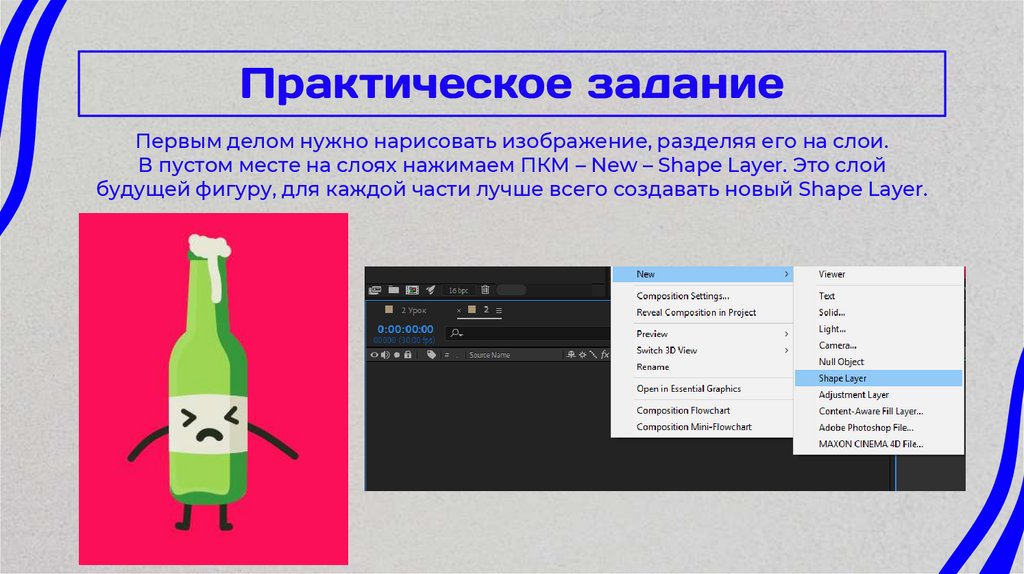 Первым делом нужно нарисовать изображение, разделяя его на слои.В пустом месте на слоях нажимаем ПКМ – New – Shape Layer. Это слой