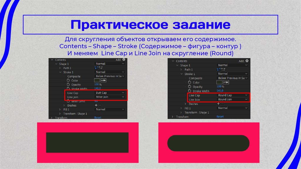 Для скругления объектов открываем его содержимое.Contents – Shape – Stroke (Содержимое – фигура – контур )
