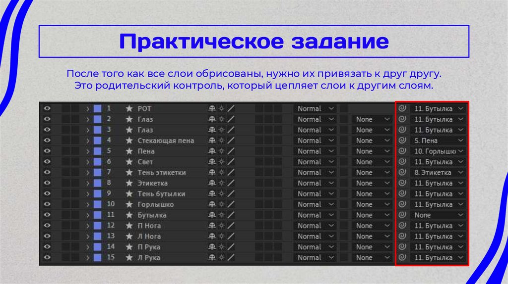 После того как все слои обрисованы, нужно их привязать к друг другу.Это родительский контроль, который цепляет слои к другим слоям.