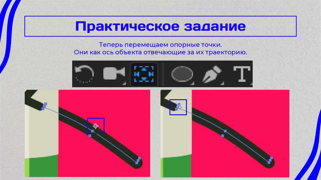 Теперь перемещаем опорные точки.Они как ось объекта отвечающие за их траекторию.