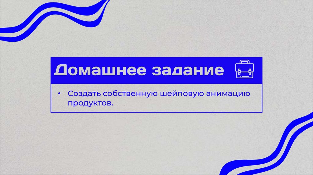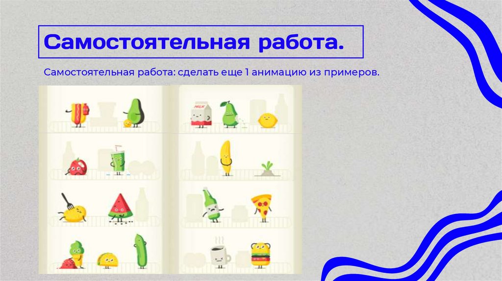 Самостоятельная работа: сделать еще 1 анимацию из примеров.26. Создать собственную шейповую анимацию продуктов.
