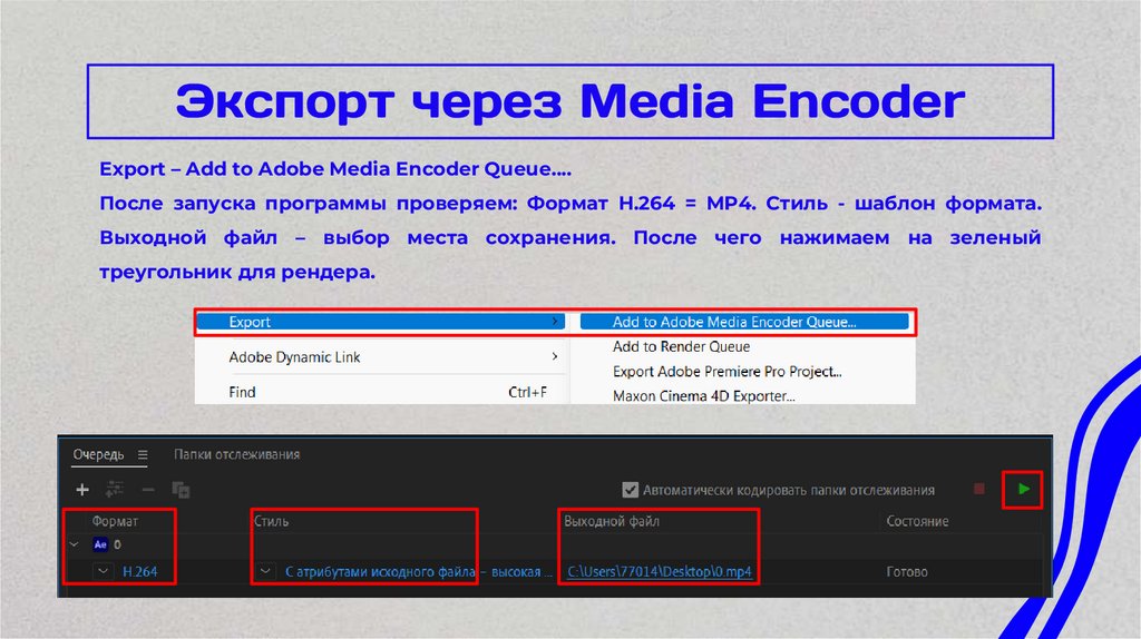 Export – Add to Adobe Media Encoder Queue….После запуска программы проверяем: Формат H.264 = MP4. Стиль - шаблон формата.