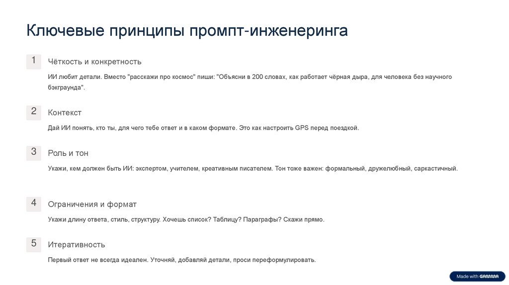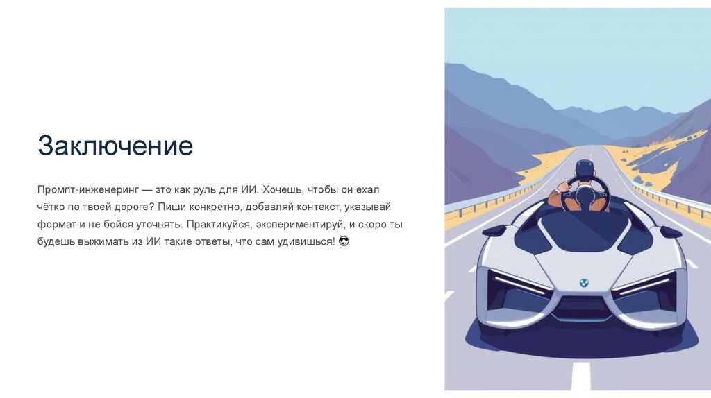 ЗаключениеПромпт-инженеринг — это как руль для ИИ. Хочешь, чтобы он ехал