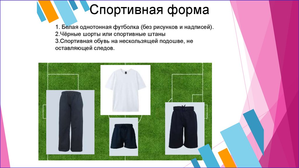 Спортивная форма1. Белая однотонная футболка (без рисунков и надписей).