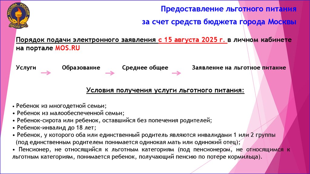 Предоставление льготного питанияза счет средств бюджета города Москвы