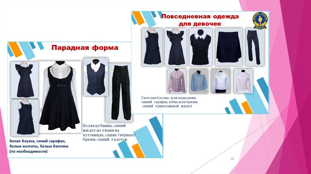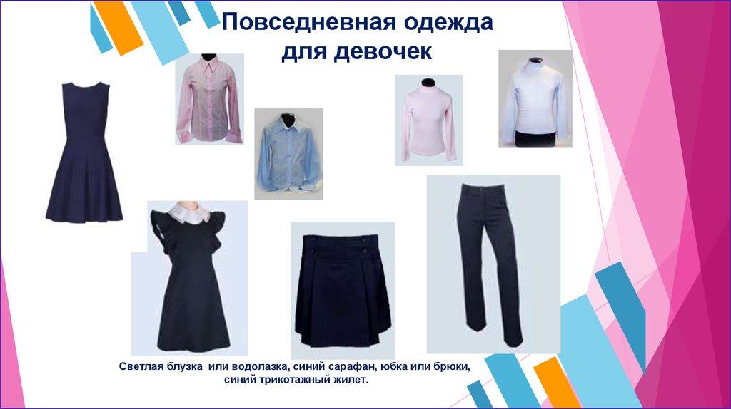 Светлая блузка или водолазка, синий сарафан, юбка или брюки,