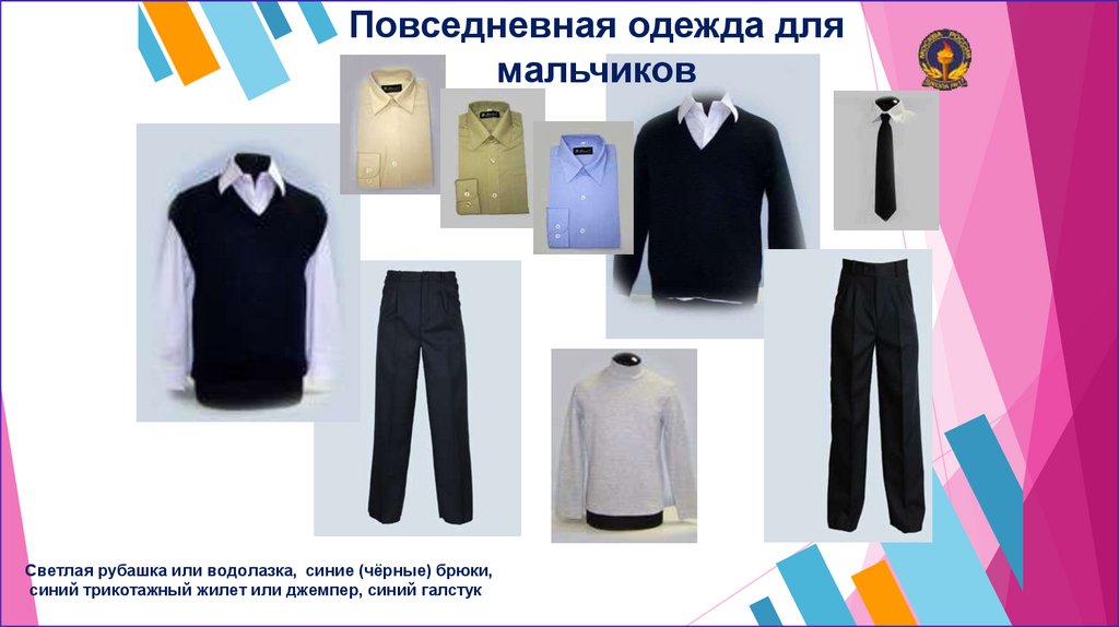 Светлая рубашка или водолазка, синие (чёрные) брюки,
