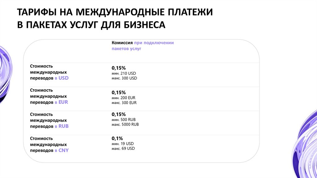 ТАРИФЫ НА МЕЖДУНАРОДНЫЕ ПЛАТЕЖИВ ПАКЕТАХ УСЛУГ ДЛЯ БИЗНЕСА
