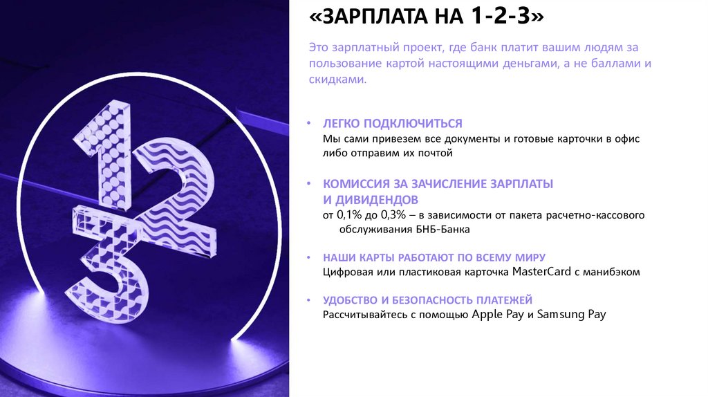 «ЗАРПЛАТА НА 1-2-3»Это зарплатный проект, где банк платит вашим людям за