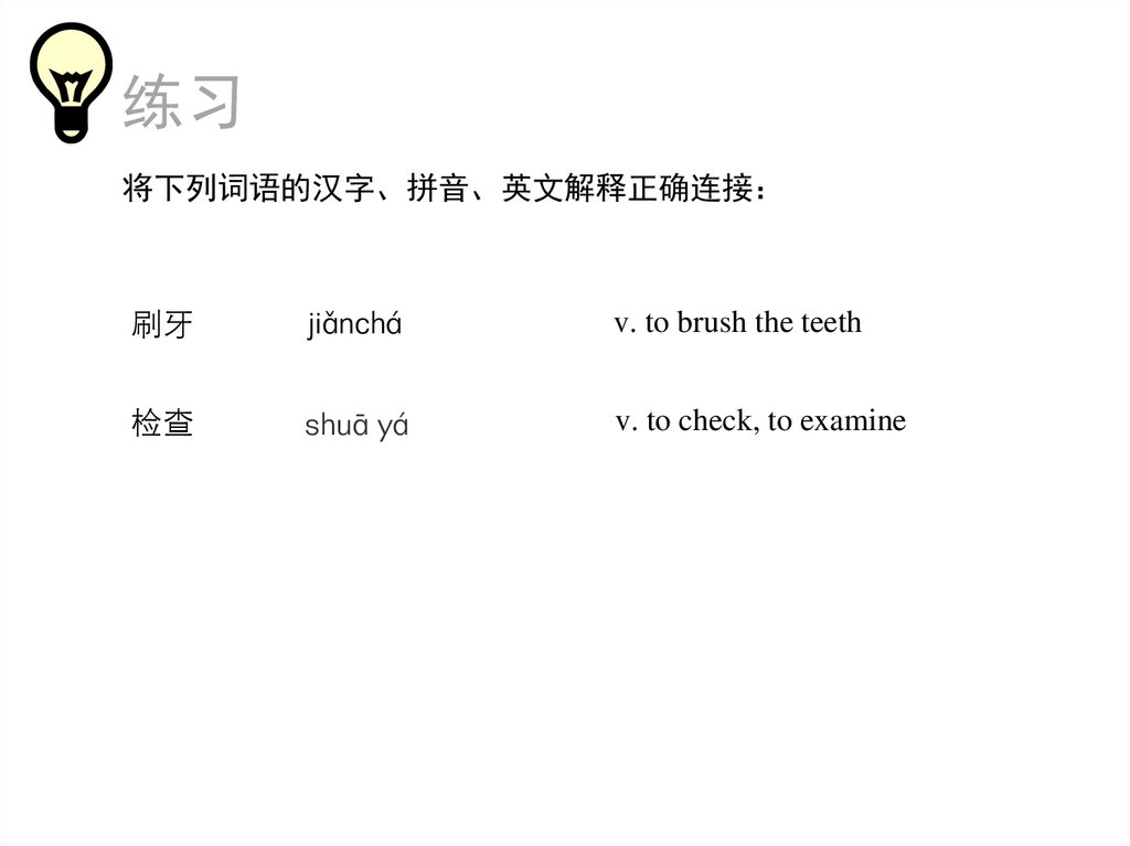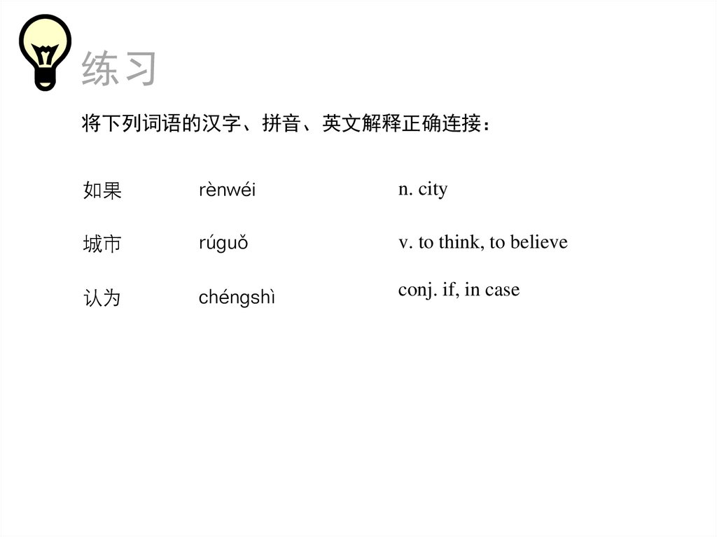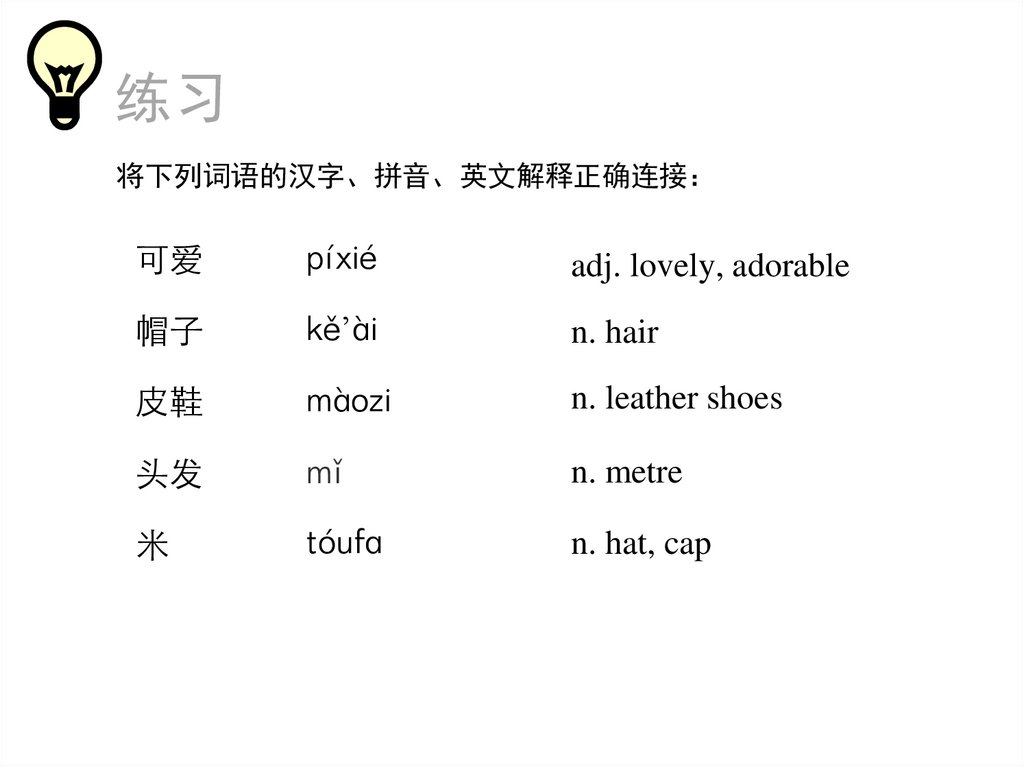 练习将下列词语的汉字、拼音、英文解释正确连接