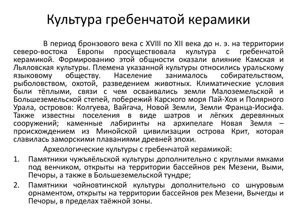 В период бронзового века с XVIII по XII века до н. э. на территориисеверо-востока Европы просуществовала культура с гребенчатой