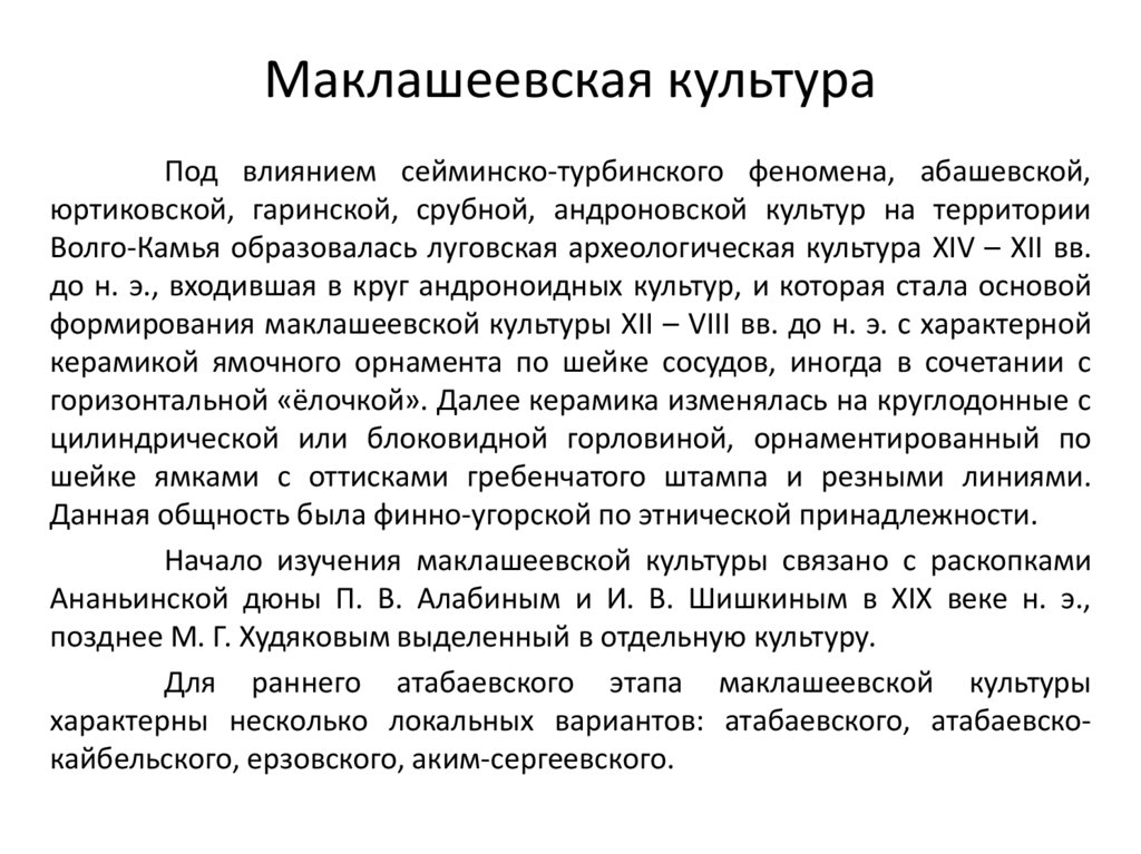 Ананьинского могольника». Ранний (Атабаевский) этап Маклашеевской