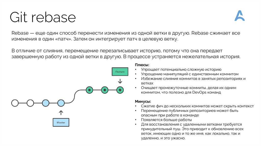 Git rebaseRebase — еще один способ перенести изменения из одной ветки в другую. Rebase сжимает все