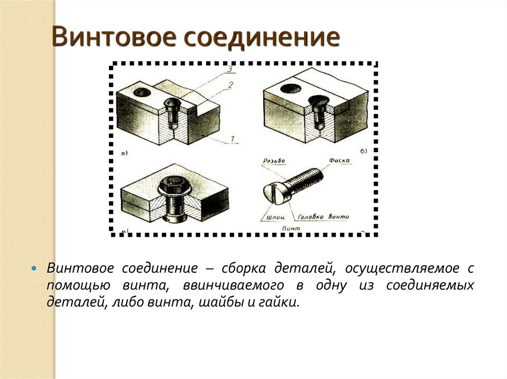 Винтовое соединение – сборка деталей, осуществляемое спомощью винта, ввинчиваемого в одну из соединяемых