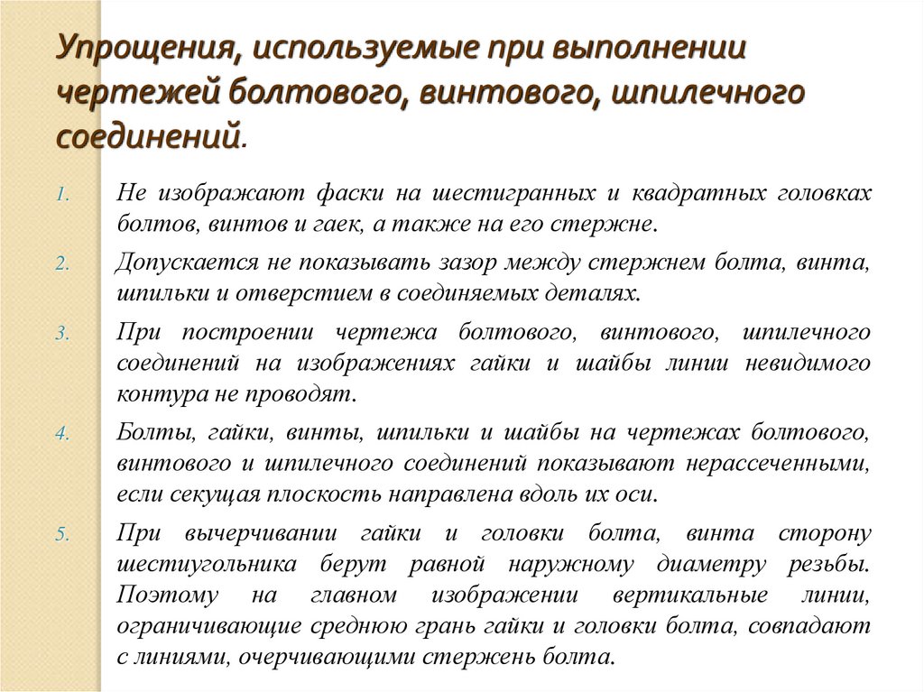 54. Упрощения, используемые при выполнении чертежей болтового, винтового, шпилечного соединений.