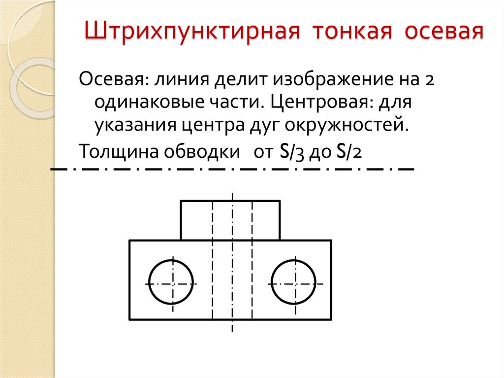 Осевая: линия делит изображение на 2одинаковые части. Центровая: для