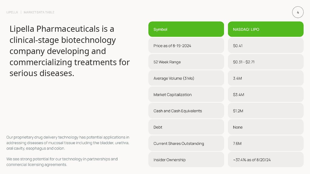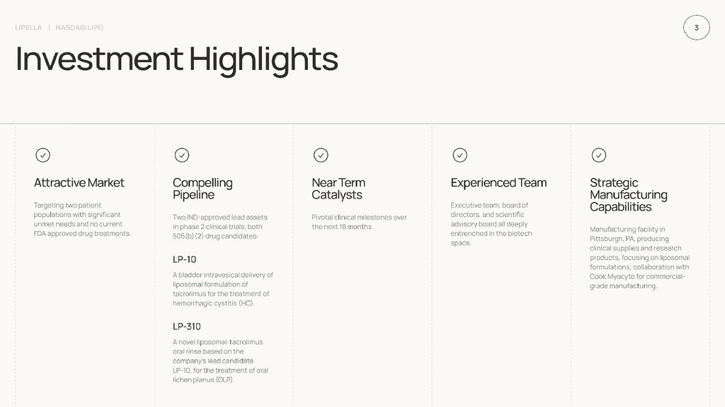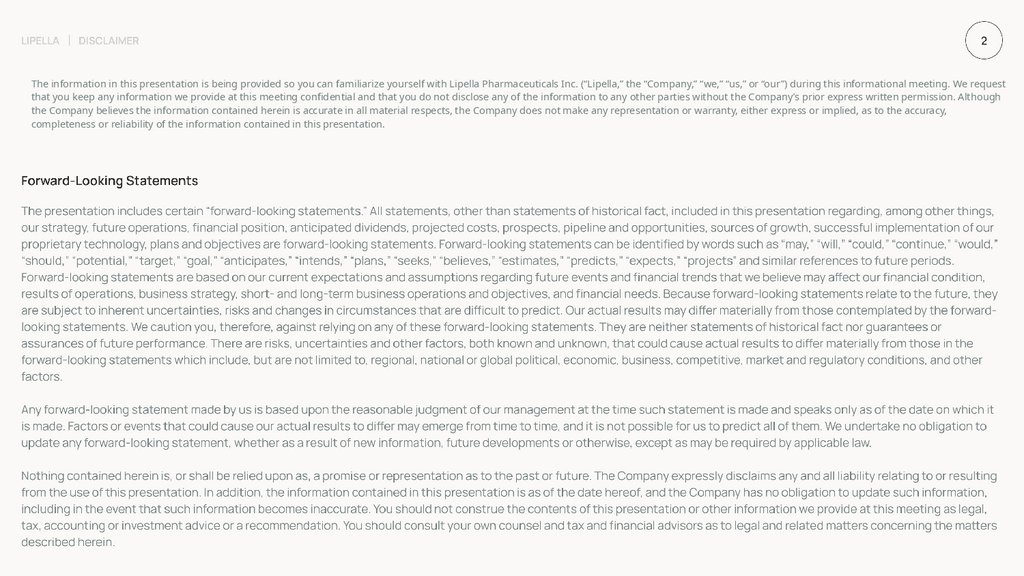 The information in this presentation is being provided so you can familiarize yourself with Lipella Pharmaceuticals Inc. (“Lipella,” the “Company,” “we,” “us,” or “our”) during this informational meeting. We requestthat you keep any information we provide at this meeting confidential and that you do not disclose any of the information to any other parties without the Company’s prior express written permission. Although