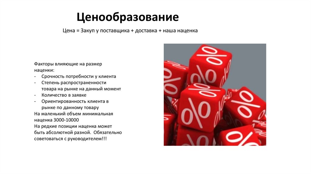 ЦенообразованиеЦена = Закуп у поставщика + доставка + наша наценка