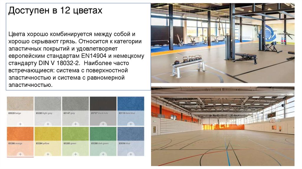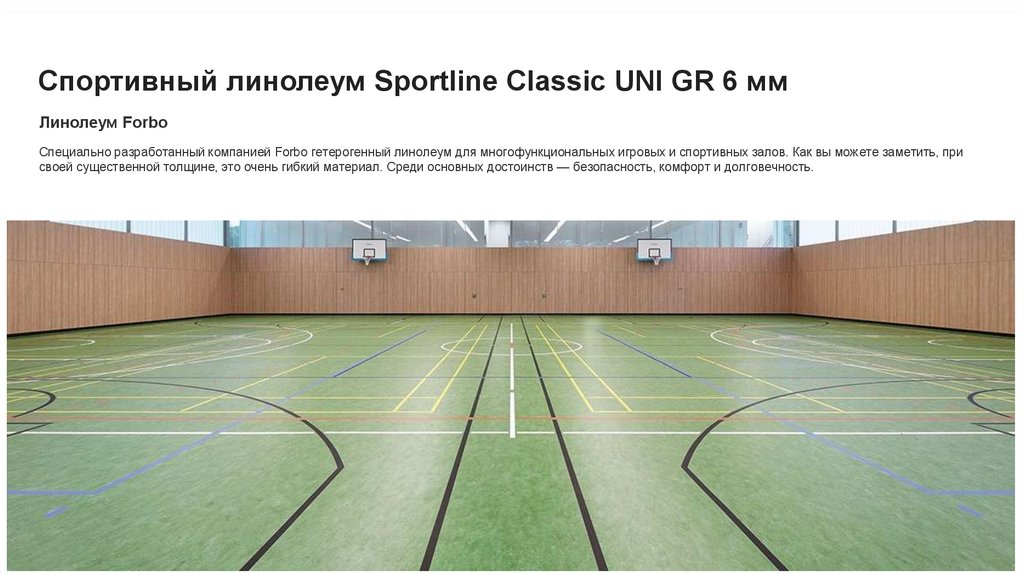 Специально разработанный компанией Forbo гетерогенный линолеум для многофункциональных игровых и спортивных залов. Как вы можете заметить, при