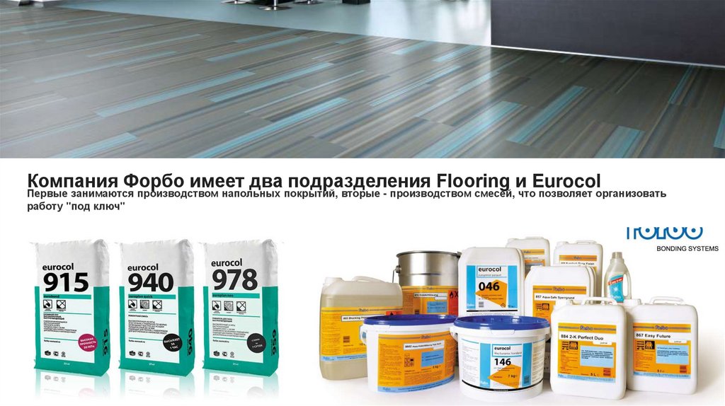 Компания Форбо имеет два подразделения Flooring и EurocolПервые занимаются производством напольных покрытий, вторые - производством смесей, что позволяет организовать
