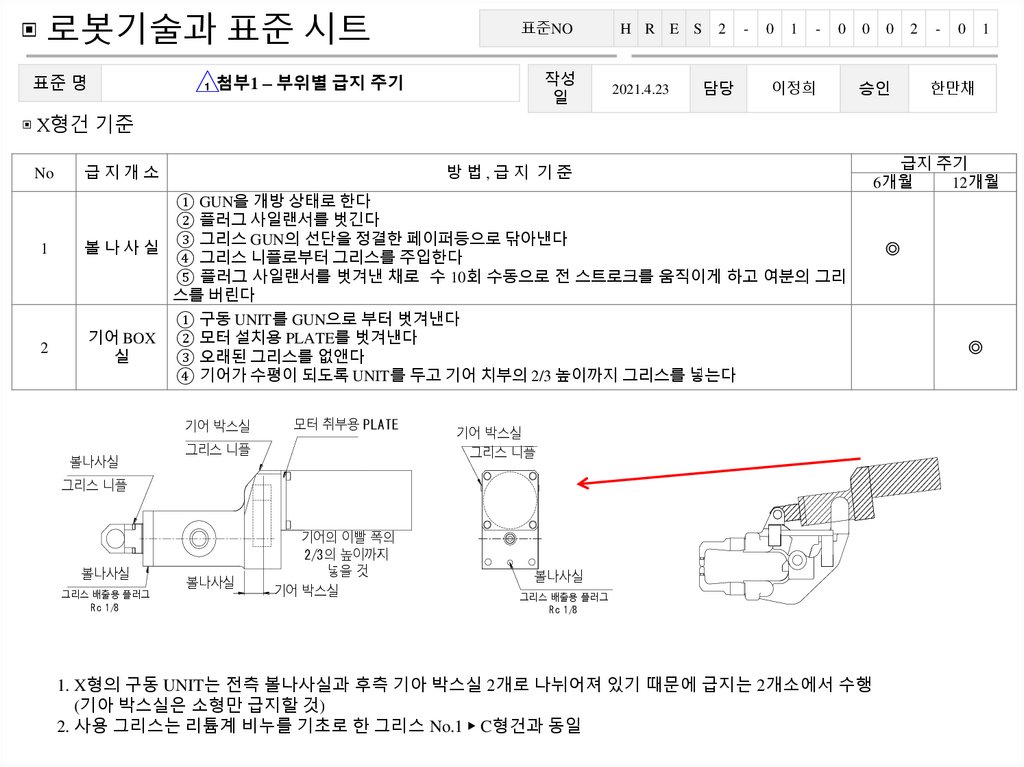 1. X형의 구동 UNIT는 전측 볼나사실과 후측 기아 박스실 2개로 나뉘어져 있기 때문에 급지는 2개소에서 수행