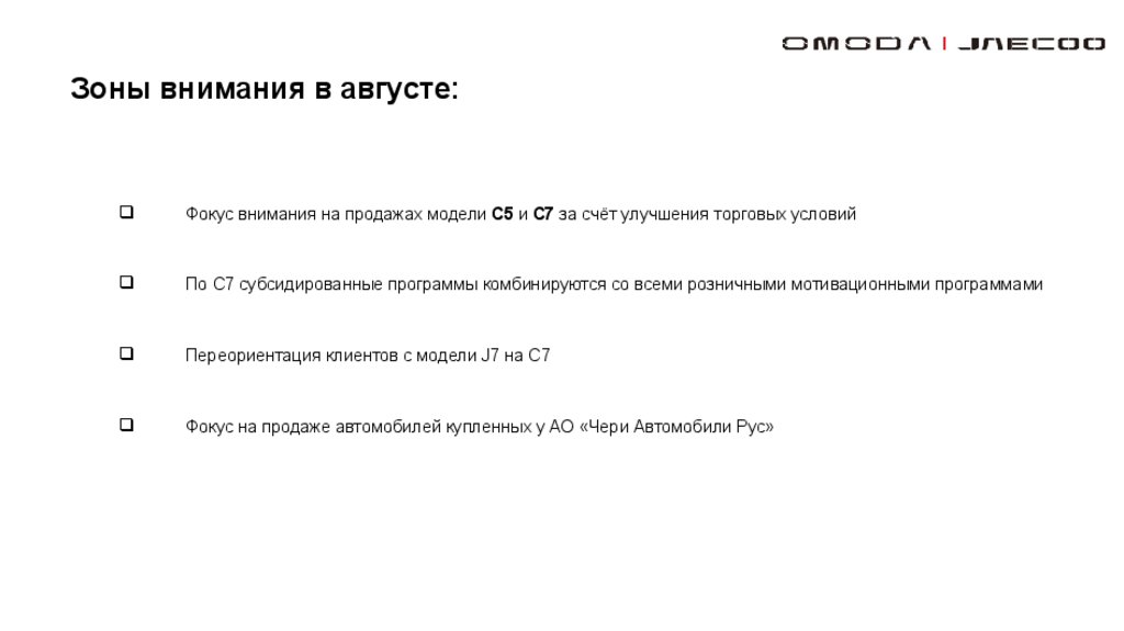 Зоны внимания в августе:Фокус внимания на продажах модели С5 и С7 за счёт улучшения торговых условий