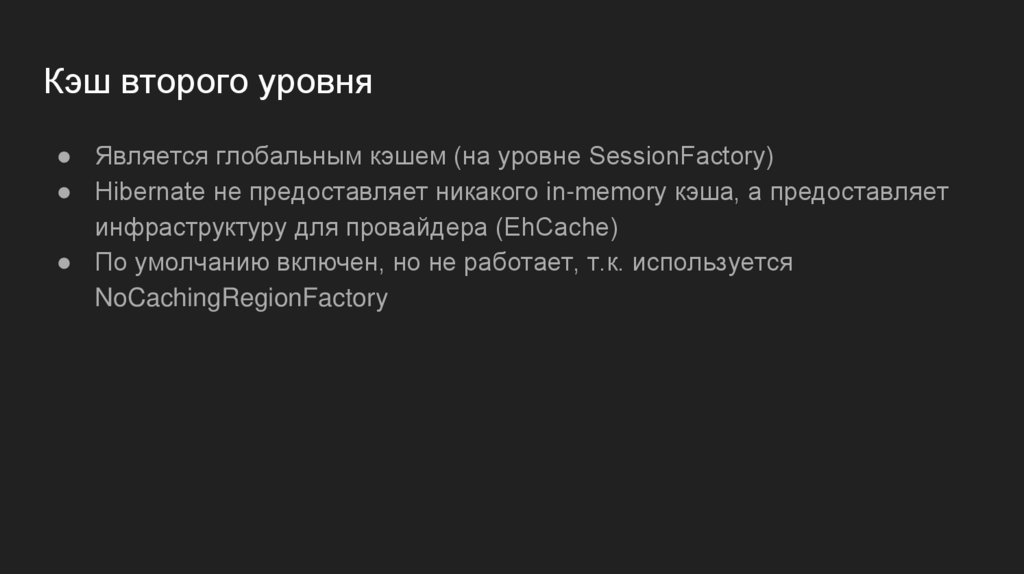 ● Hibernate не предоставляет никакого in-memory кэша, а предоставляет