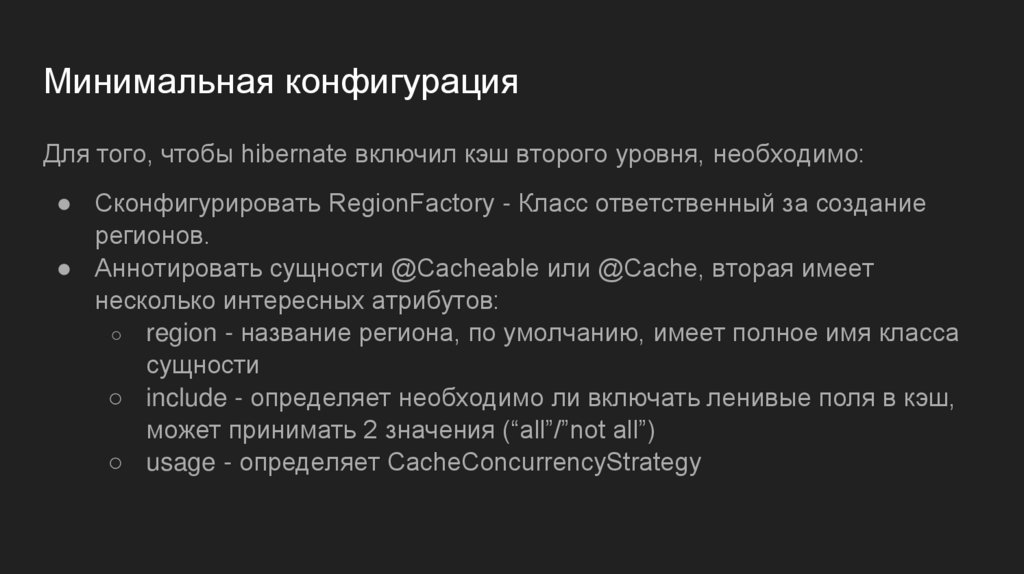 Минимальная конфигурацияДля того, чтобы hibernate включил кэш второго уровня, необходимо: