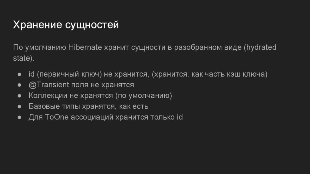 Хранение сущностейПо умолчанию Hibernate хранит сущности в разобранном виде (hydrated